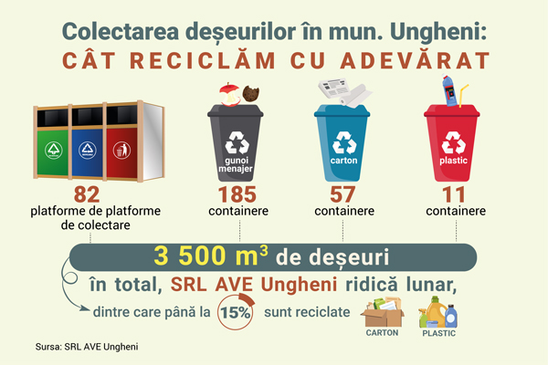 La Ungheni, colectarea selectivă a deșeurilor nu e doar o obligație legală, ci o nevoie urgentă într-un oraș în continuă creștere. Sistemul a început promițător în 2008 – un parteneriat public-privat încheiat între Consiliul Municipal Ungheni și grupul austriac AVE/Energie AG. Au fost instalate containere etichetate corespunzător: „hârtie”, „plastic” și „gunoi menajer”. Totuși, după 17 ani, doar 10%-15% din gunoiul colectat ajunge efectiv să fie reciclat. Restul… tot la gunoiștea din Cetireni. Situația s-ar putea schimba după 1 iulie 2018, când noua lege privind serviciul public de salubrizare va obliga fiecare persoană să colecteze deșeurile separat. Am discutat cu administratoarea companiei de colectare a deșeurilor, cu o activistă de mediu și cu Ministerul Mediului despre posibile soluții pentru a responsabiliza oamenii, dar și autoritățile.