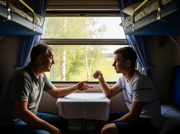 Locomotiva a fluierat prelung și trenul s-a urnit din loc. Încet-încet, au prins a rămâne în urmă clădiri, poduri, indicatoare. În cupeu era prea cald, cu toate că se apropia seara, aerul îmbâcsit îți dădea de înțeles că vei avea o călătorie nu prea plăcută. Erau puțini pasageri, cum se vede, din cauza arșiței și a drumului prea lung. Unicul meu condrumeț era un bătrânel trist, tăcut și, într-un fel, absent. Am observat că la plecare i-au dat lacrimile. Semăna cu un profesor de la sat. Avea puține bagaje. Și-a scos pălăria, a pus-o alături pe banchetă, s-a rezemat de fereastră și a rămas nemișcat. A mai trecut vreo oră. Am scos din geantă termosul, două pahare de hârtie și i-am propus tovarășului meu de drum un ceai. A acceptat și m-a întrebat: „Mergeți chiar până la București?”. I-am spus că am la București un atelier de lucru: „Mă numesc Roman. Plec în deplasare de serviciu”.