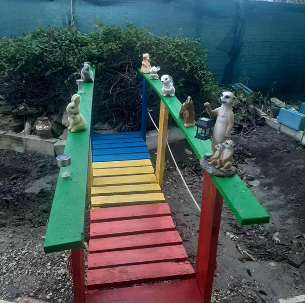 Structura din lemn este vopsită în roșu, galben, verde și albastru, iar pe balustrade sunt așezate mai multe figurine — iepurași, câini, veverițe, dar și un suricat care ține o lampă decorativă. Acest amestec de culori și personaje creează o atmosferă jucăușă, aproape de poveste, contrastând puternic cu spațiul din jur, aflat încă în amenajare.